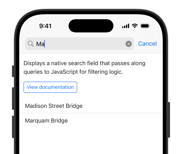 JavaScript events could greatly improve the DX around some components, like the Search Component. This component adds a native search bar to the app and passes the typed query to JavaScript.