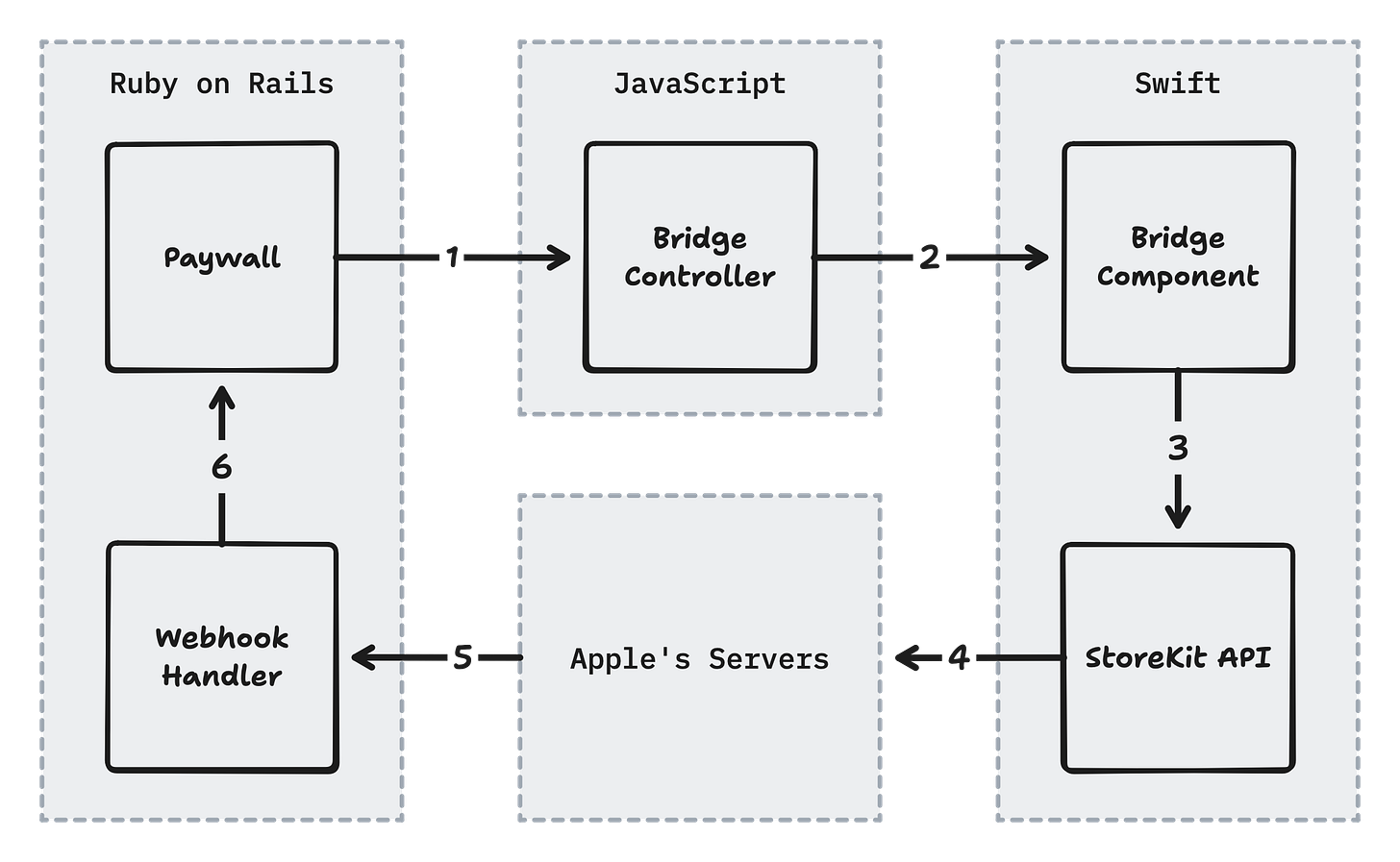 This article walks through the full flow: triggering a purchase from your HTML paywall, handling it in Swift, processing Apple’s webhooks, and updating the UI in real-time with Turbo Streams. I’ve built this for a bunch of clients over the past 10+ years, and the approach here is exactly how PurchaseKit works under the hood.