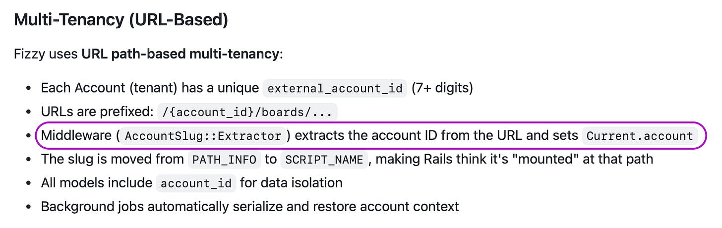 Under the hood, Fizzy uses middleware to enable URL-based multi-tenancy. The middleware adds a path to every URL when an account is selected.