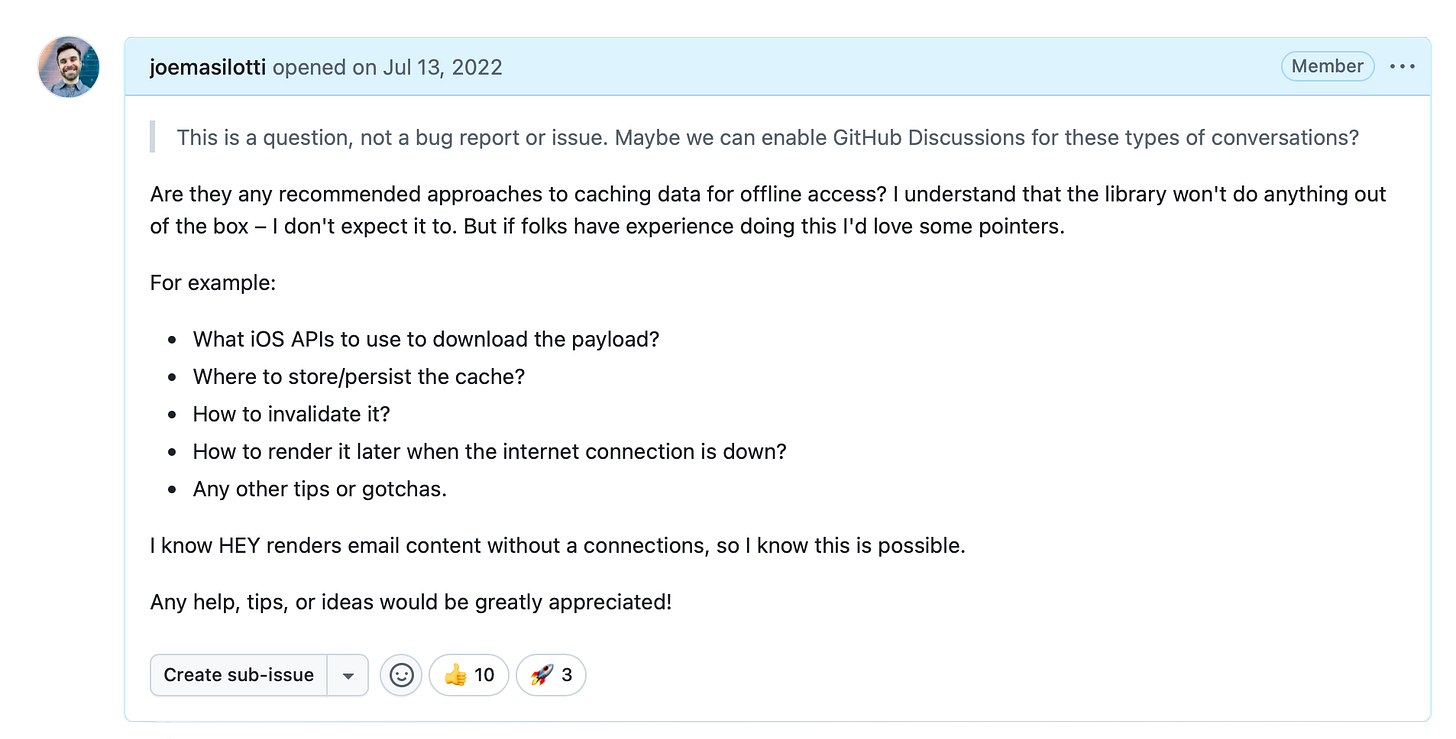 Jay, the mobile team lead at 37signals, responded with an overview of how they implemented caching for HEY. It involved spinning up a proxy server inside the iOS app. Sadly, “this was a pretty large effort of the team and a substantial amount of work” and was never abstracted.