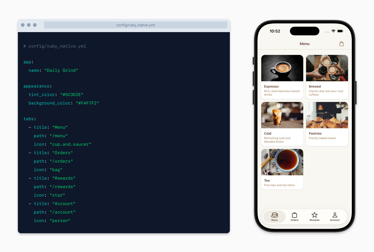 You add a gem to your Rails app. You write a YAML file that defines your app name, colors, and tabs. You run a command, scan a QR code, and see your app running natively on your iPhone. The whole thing takes about ten minutes.